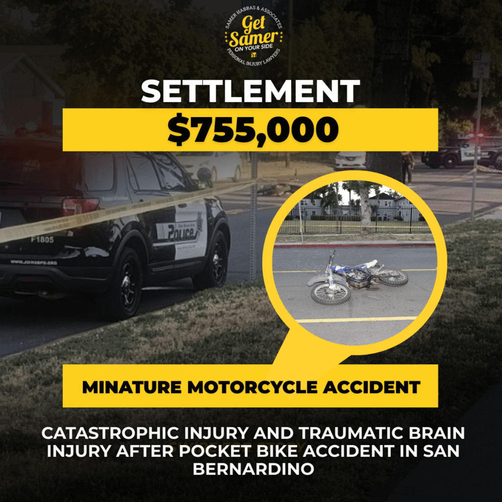 The Law Offices of Samer Habbas & Associates secured a $775,000 settlement for a client who suffered lower extremity injuries and traumatic brain injury after a pocket bike (miniature motorcycle) collision in San Bernardino, California.